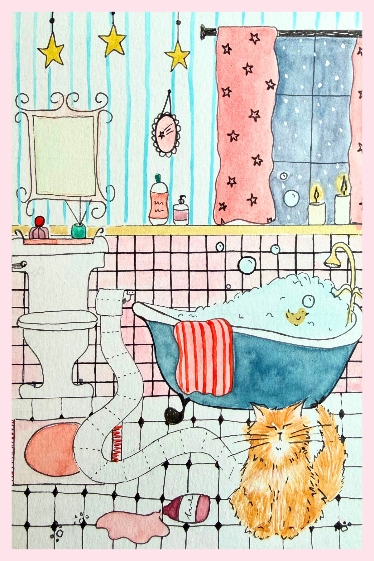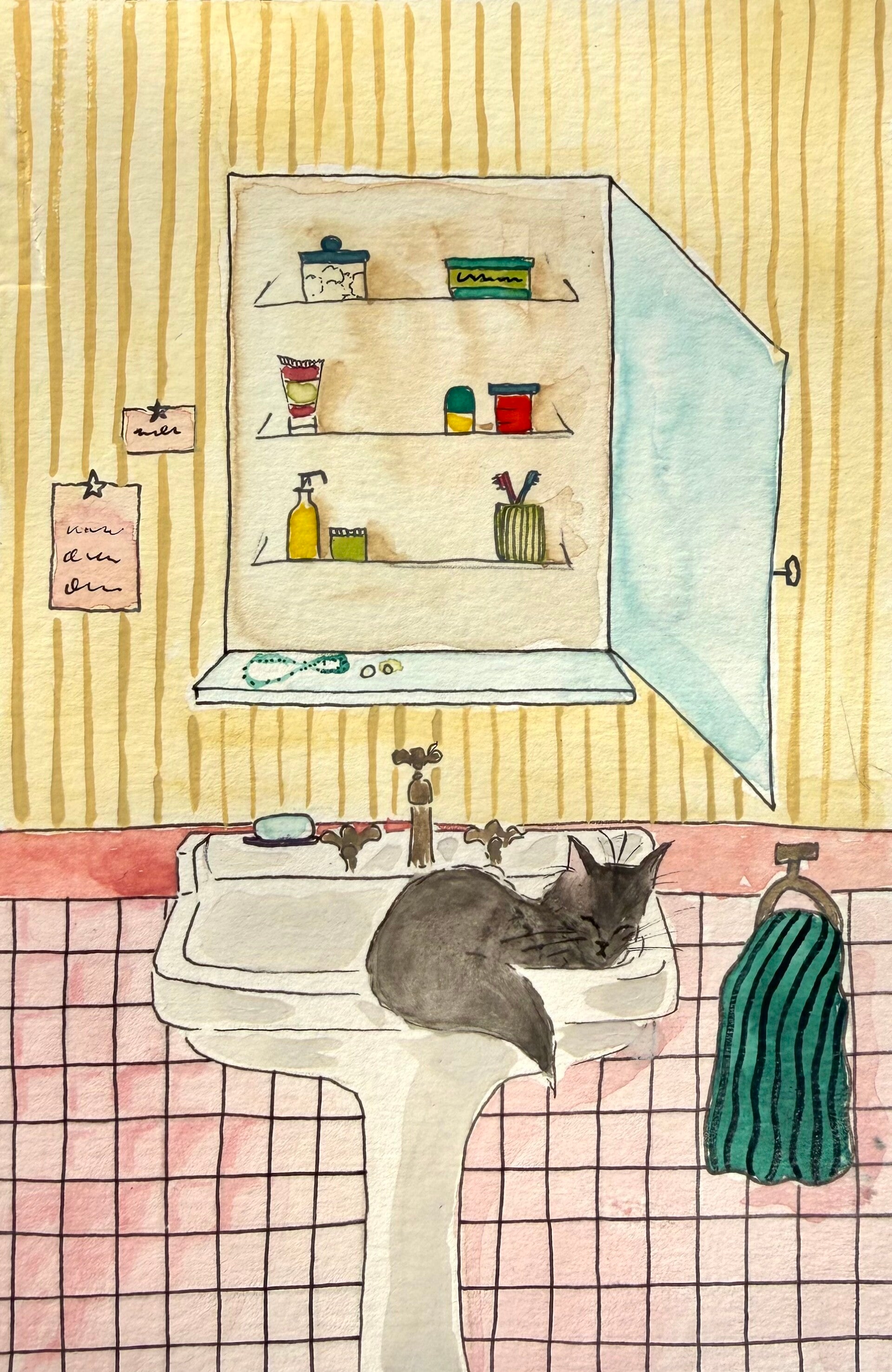 Gus, also known as Goose, is painted in a whimsical bathroom scene curled up in the sink. This physical art print is hand packed and mailed as a one ounce letter, often with a couple tiny surprises. Collect him on his own or as part of the full 12-cat set.