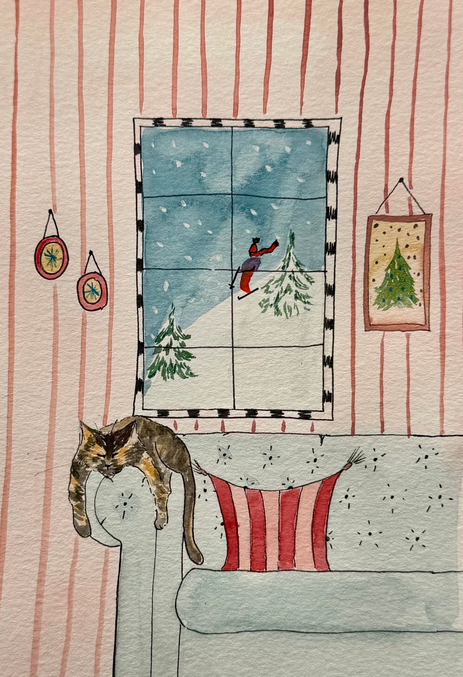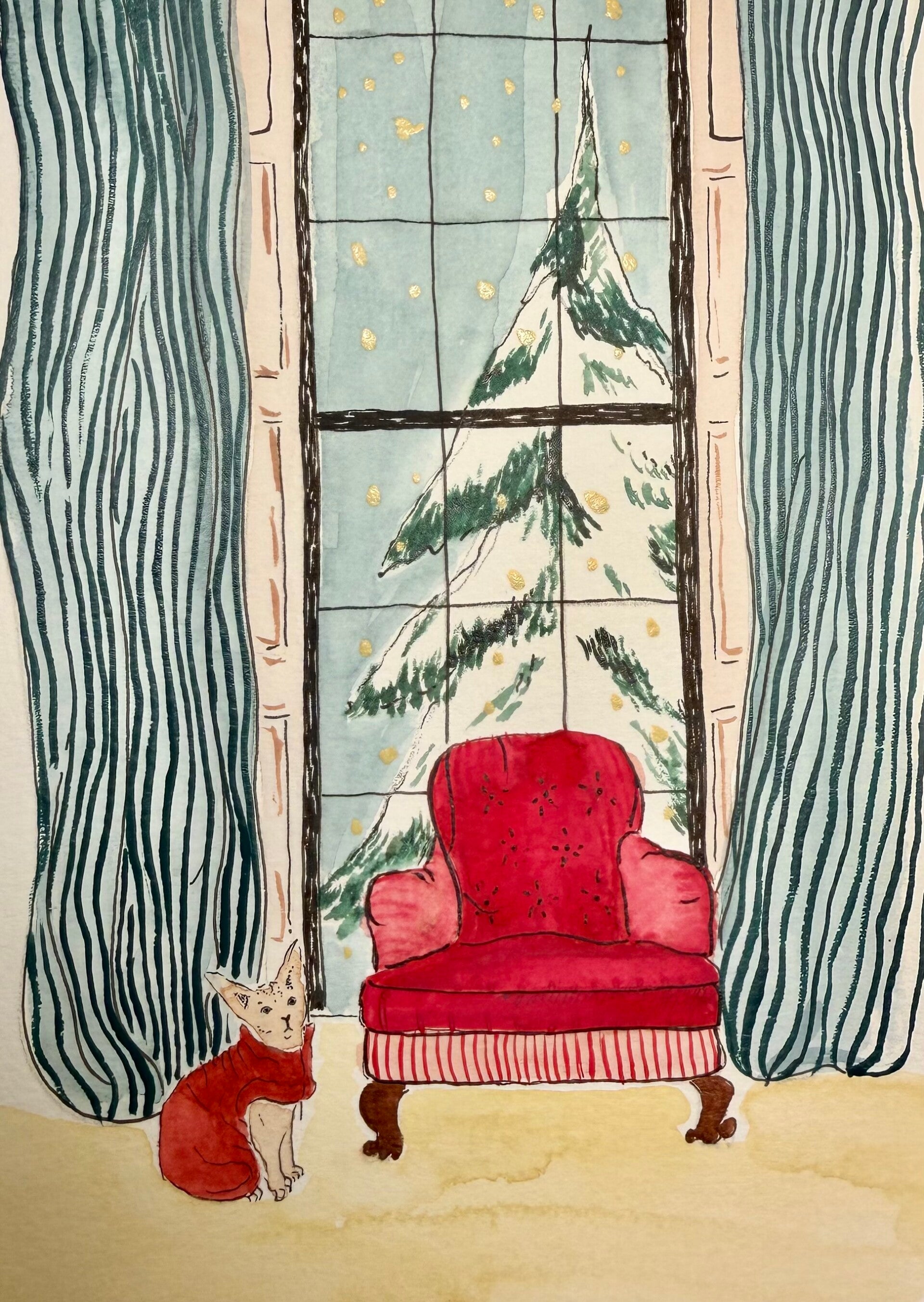 Luna is the final cat in the 12 Cats of Christmas series, painted slumped over the arm of a couch with snow falling outside. This physical art print is hand packed and mailed as a one ounce letter, often with a couple tiny surprises. Collect Luna on her own or as part of the complete 12-cat set.