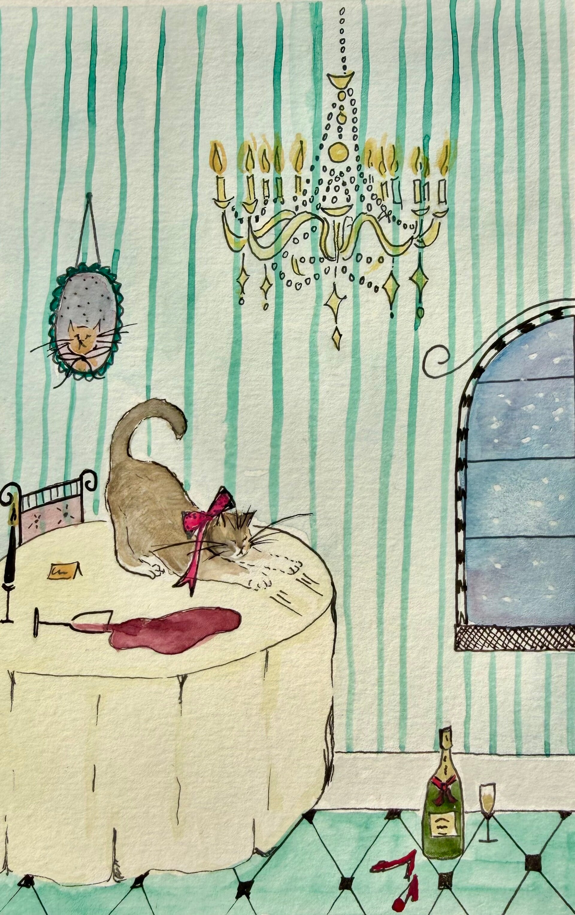 Marcy is painted in a whimsical ballroom scene with snow falling outside and a sparkling chandelier above. This physical art print is hand packed and mailed as a one ounce letter, often with a couple tiny surprises. Collect her on her own or as part of the full 12-cat set.